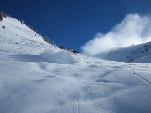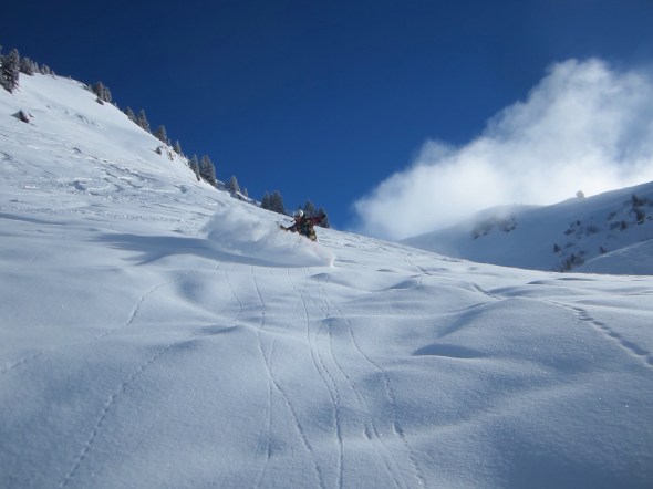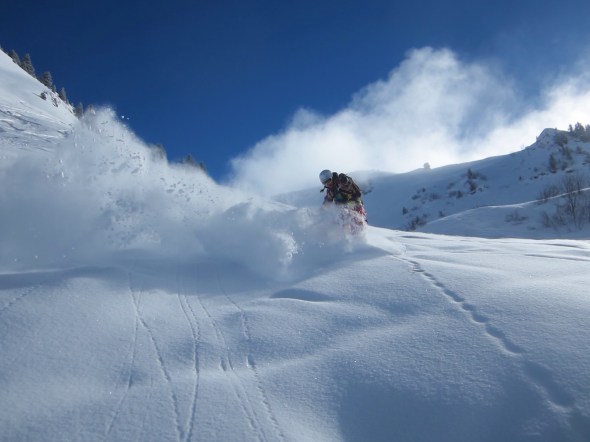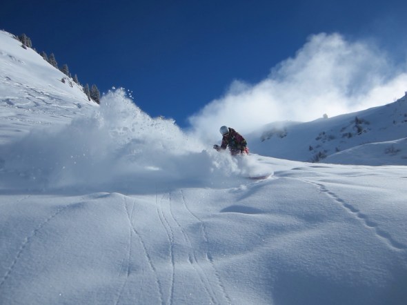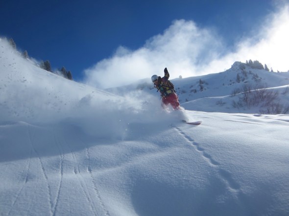 Julie lets rip in fresh untracked powder on a glorious sunny powder day up in a Chamossiere bowl (the back of Nyon). This was a very good day. A very good day.