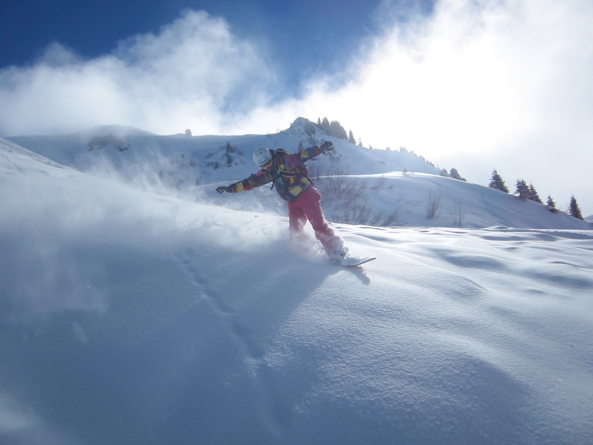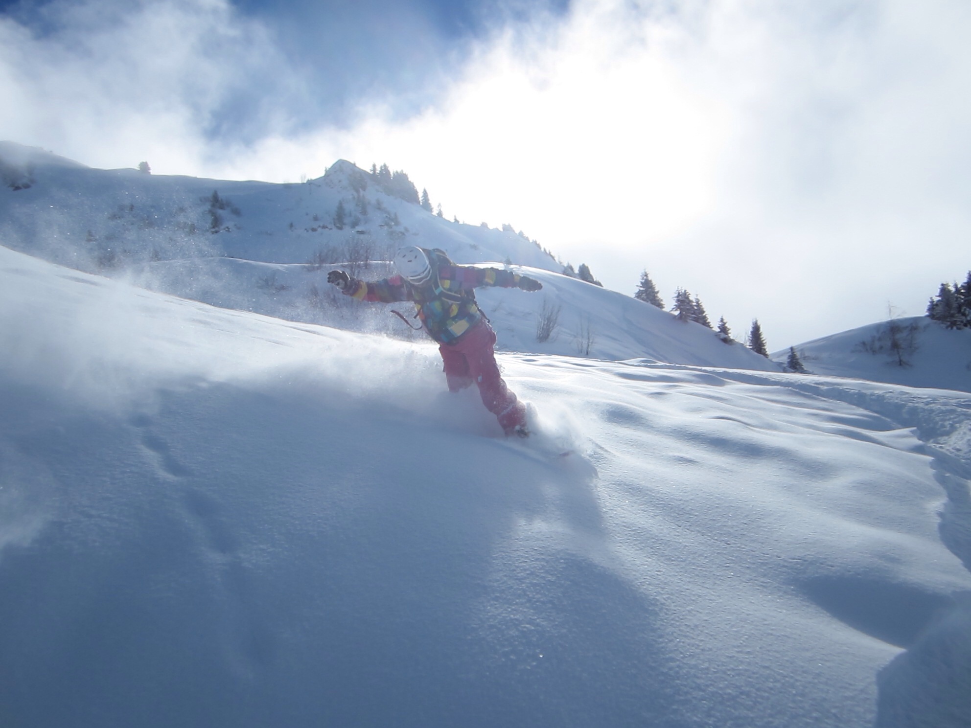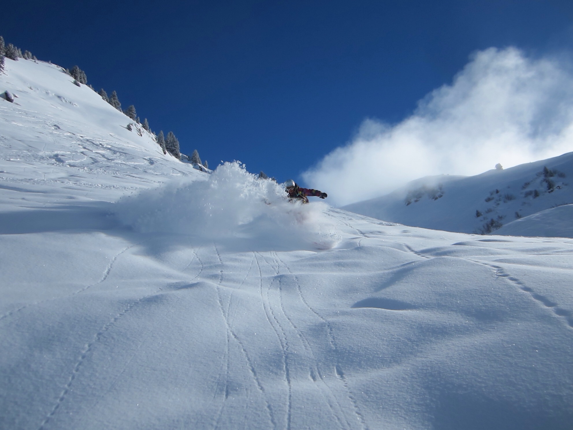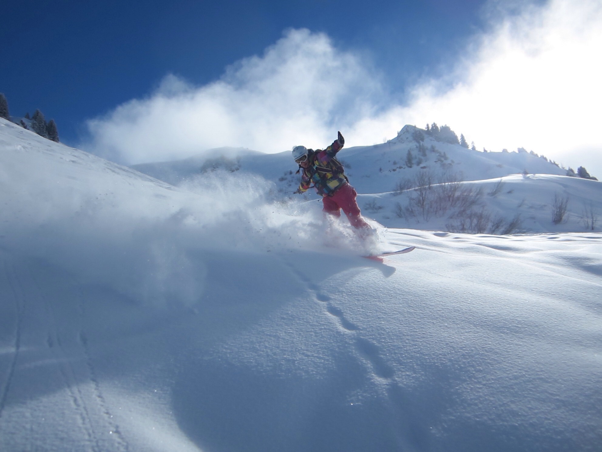 Julie lets rip in fresh untracked powder on a glorious sunny powder day up in a Chamossiere bowl (the back of Nyon). This was a very good day. A very good day.