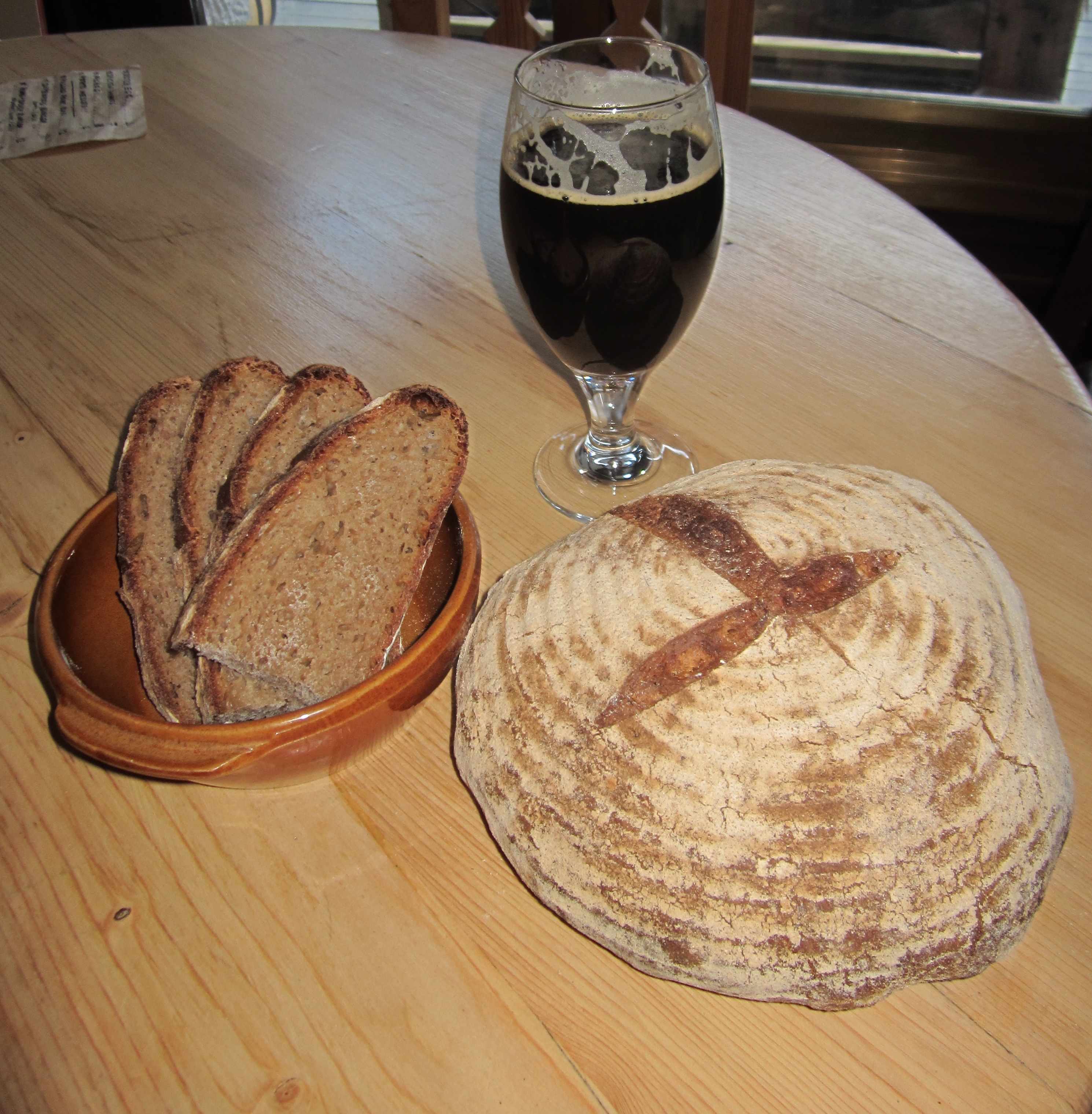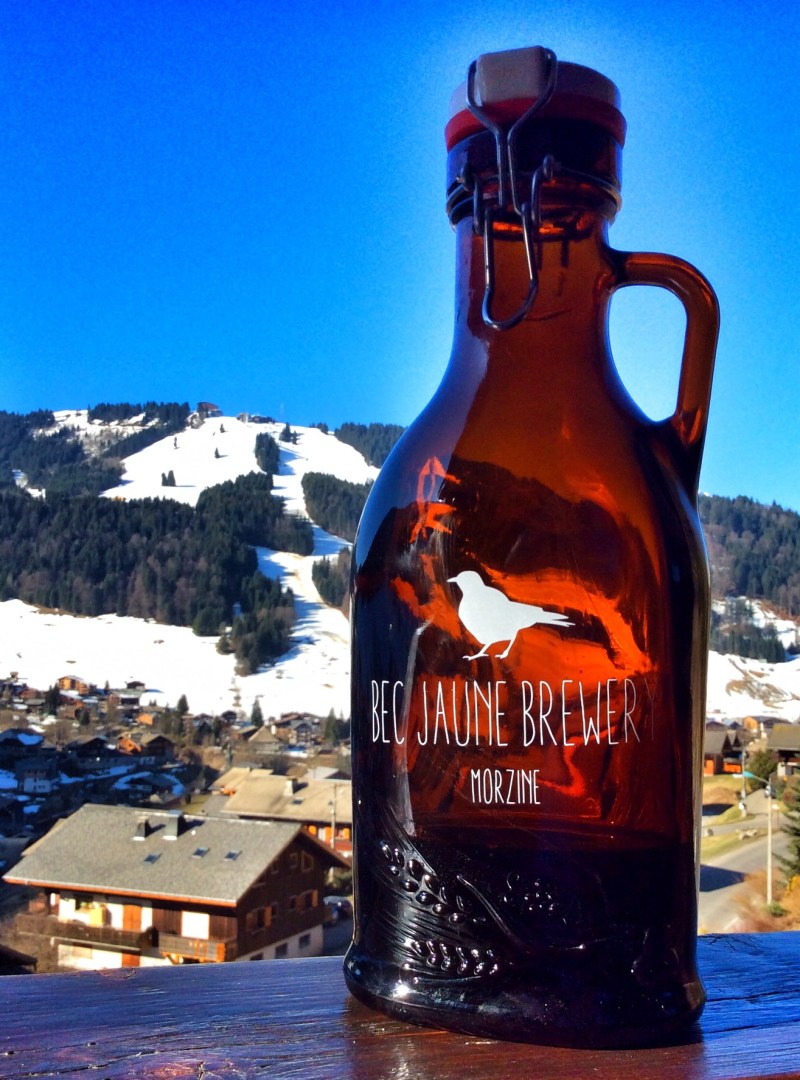 So bread making has been going well for the local brewery, Le Bec Jaune. We have made 6 various sourdough loaves for them over the past week to accompany their plat du jours – steak & kidney pie and pasta. Monday is St Patrick’s Day and Le Bec Jaune is putting on a lamb stew to celebrate and to accompany their tasty dark beers – currently an Extra Stout and Porter are on tap. We were given a little of their Extra Stout to experiment with in our bread making. Le Bec Jaune have also just received some fantastic take-away flagons. The above picture is of their one litre version, with not quite so much stout left in it…) The resulting sourdough was a deliciously complex darker bread, and will go perfectly with the stew. 3 loaves have been commissioned. We are using our original stout recipe for 2 of them (as per below – follow same recipe as per previous post: Sourdough in the Snow) and the third we are going all out with the stout (no water)…