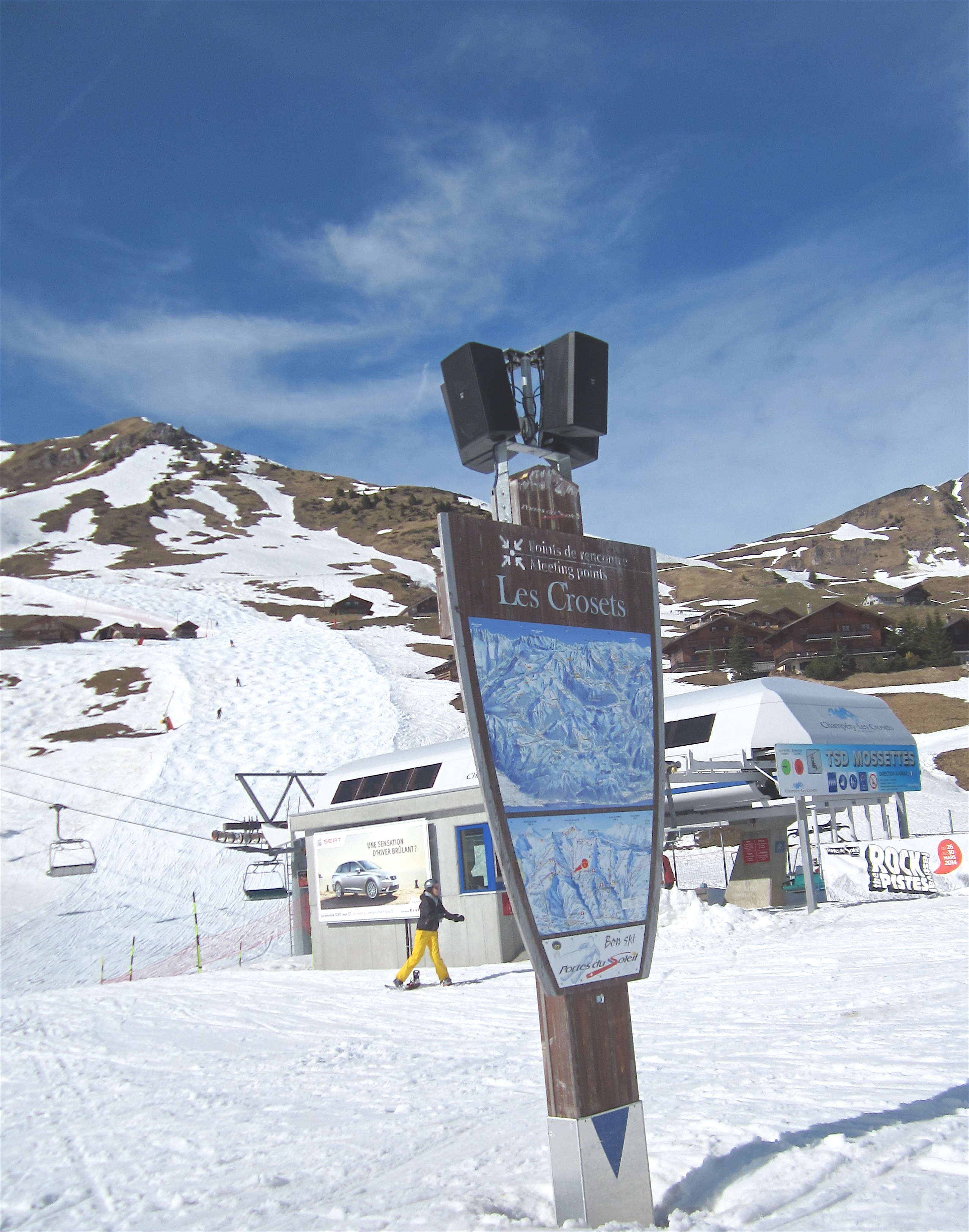 Champery is one of the smaller resorts of the the Porte du Soleil, it is however one of the resorts with the run on which we spent the most amount of time. This is not because it had a favourite run of ours, or that the run was very long – although it did have two lovely long red runs (one which we enjoyed on a number of occassions). It was because we had to walk from the bottom of the Ripaille 1&2 T-bar and telesiege all the way down to Champery along what should have been the Grande Planachaux piste. This was our second to last piste which we completed, this was not for trying, every single time we went to try and do the run it was closed/ferme. In fact as we were enjoying the two hour walk down the valley to Champery we agreed that it was unlikely that le Grande Planachaux piste had been open at any point in the season. This is a pity because it is a fantastic long, steep, red run all the way down from Les Crosets to Le Grande Paradis chair. We did manage to snowboard (small) parts of it and when we were not we were able to enjoy the beautiful scenery and reflect upon our season, our mission, our accomplishments and the challenges that still awaited us across the vast Porte du Soleil piste and off-piste.