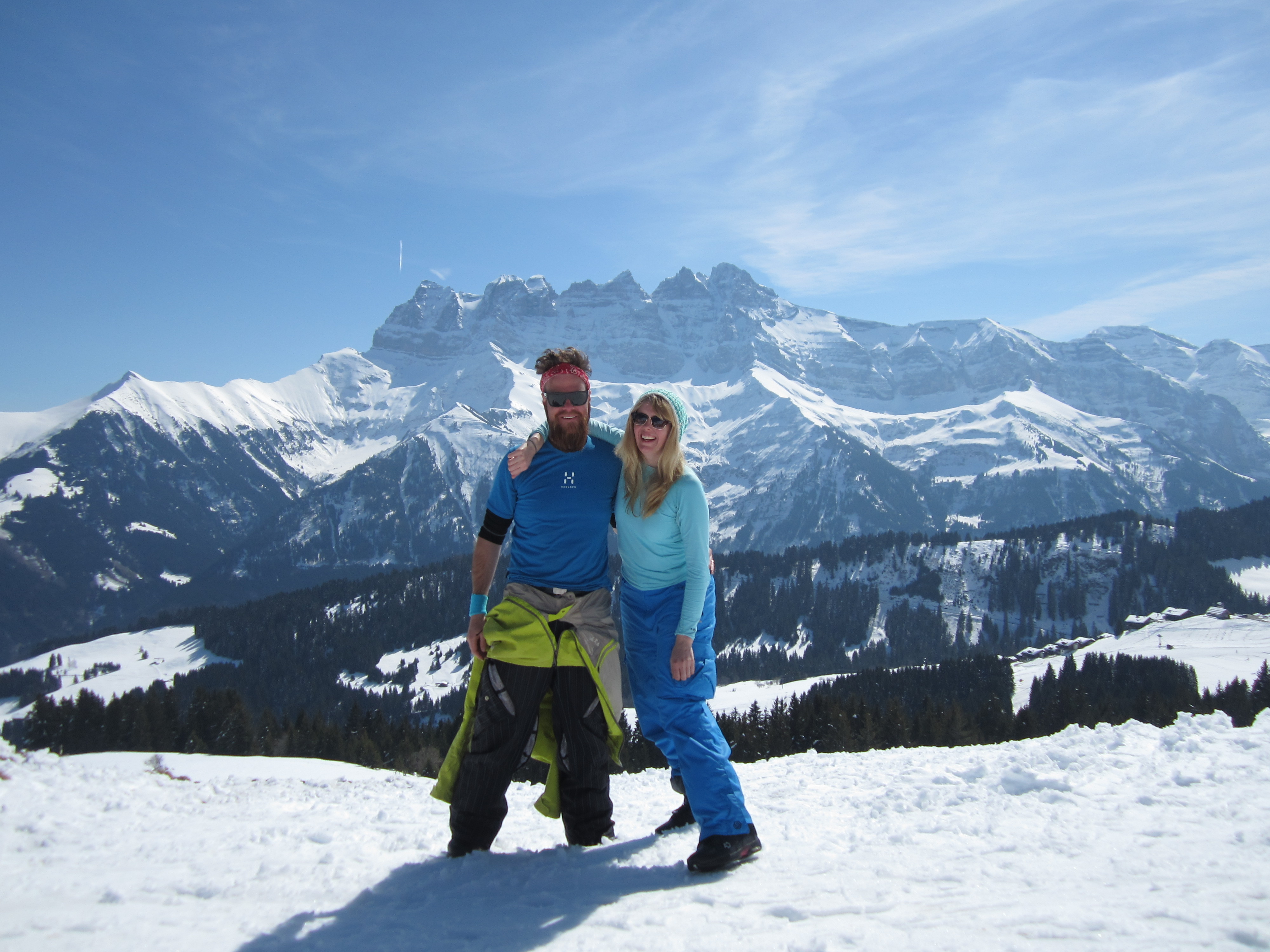 Champoussin was the resort that we didn’t ever go to for riding. We spent some time ticking off the runs, but it was generally on our way to or from Morgins. It was very quiet though, and we had a lovely day riding with Jeany. It was a hot, sunny day and the pistes were becoming very slushy but were still freshly groomed from the night before. What we experienced was similar to powder riding on pisted slush. It was fantastic going flat out, leaning right back on the tail and cutting slushy carves. It was also the backdrop to one of our favourite views in the Portes du Soliel. The Dents du Midi (translated as the Teeth of the South).
