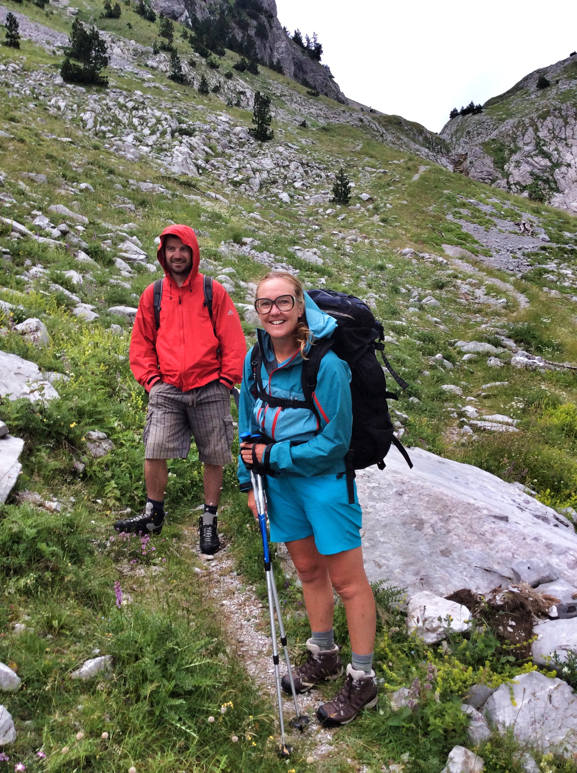 Julie, grinning and bearing it with the pack on day 9 (and an unusual photo of Pavlin smiling 🙂
