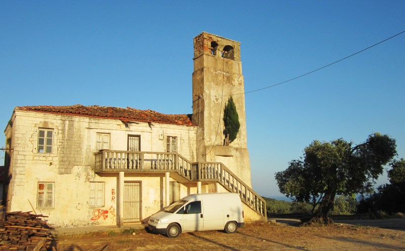 Parking up in Vuno and the pine that is growing in the building.