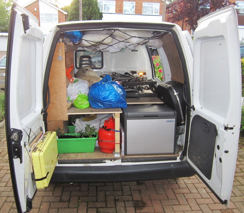 The finished product. Elevated sleeping area (covered with fold up bikes, bell tent and bedding, fridge, gas stove (collapsed on the left door), herb garden in green pots, and plenty of storage space underneath.