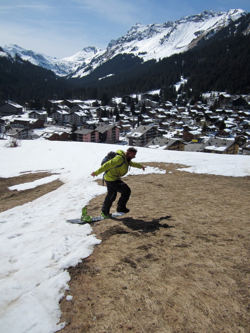 Unsuccessful one footing down the last piece of snow into Morgins village.