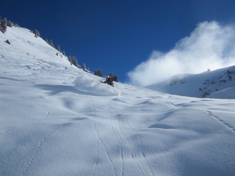 Julie lets rip in fresh untracked powder on a glorious sunny powder day up in a Chamossiere bowl (the back of Nyon). This was a very good day. A very…